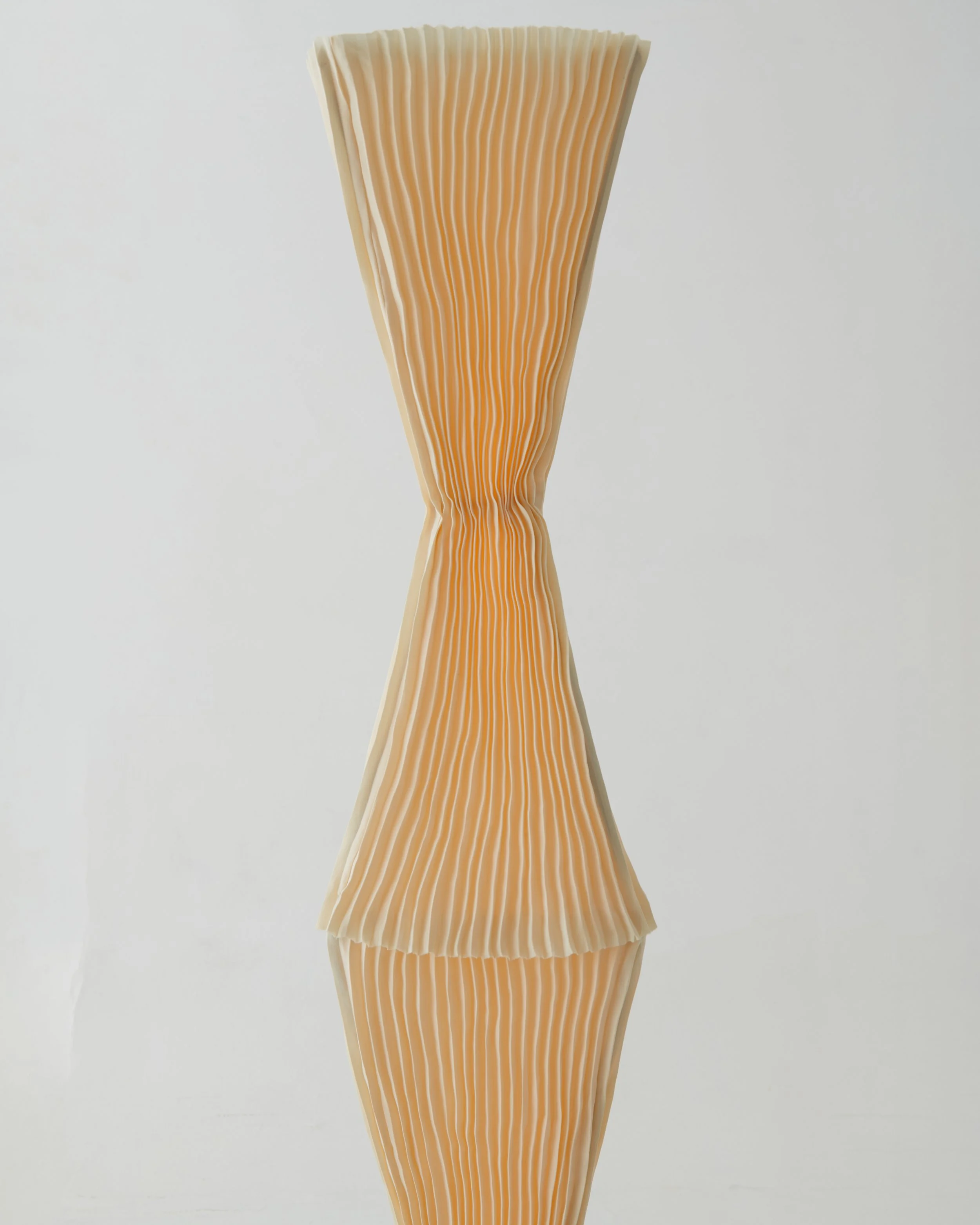 Warm light filters through layers of hand sculpted textile. Delicate details meticulously repeated, draped onto a steel frame and held in place by steel pearls. Inspired by architectural forms, this piece is a tower with no end.