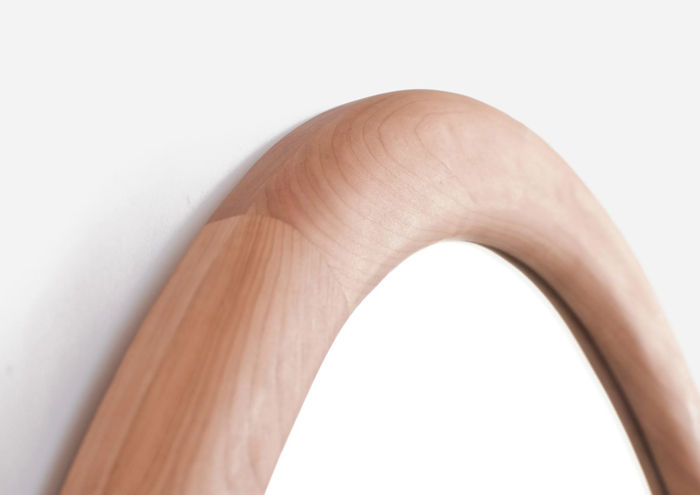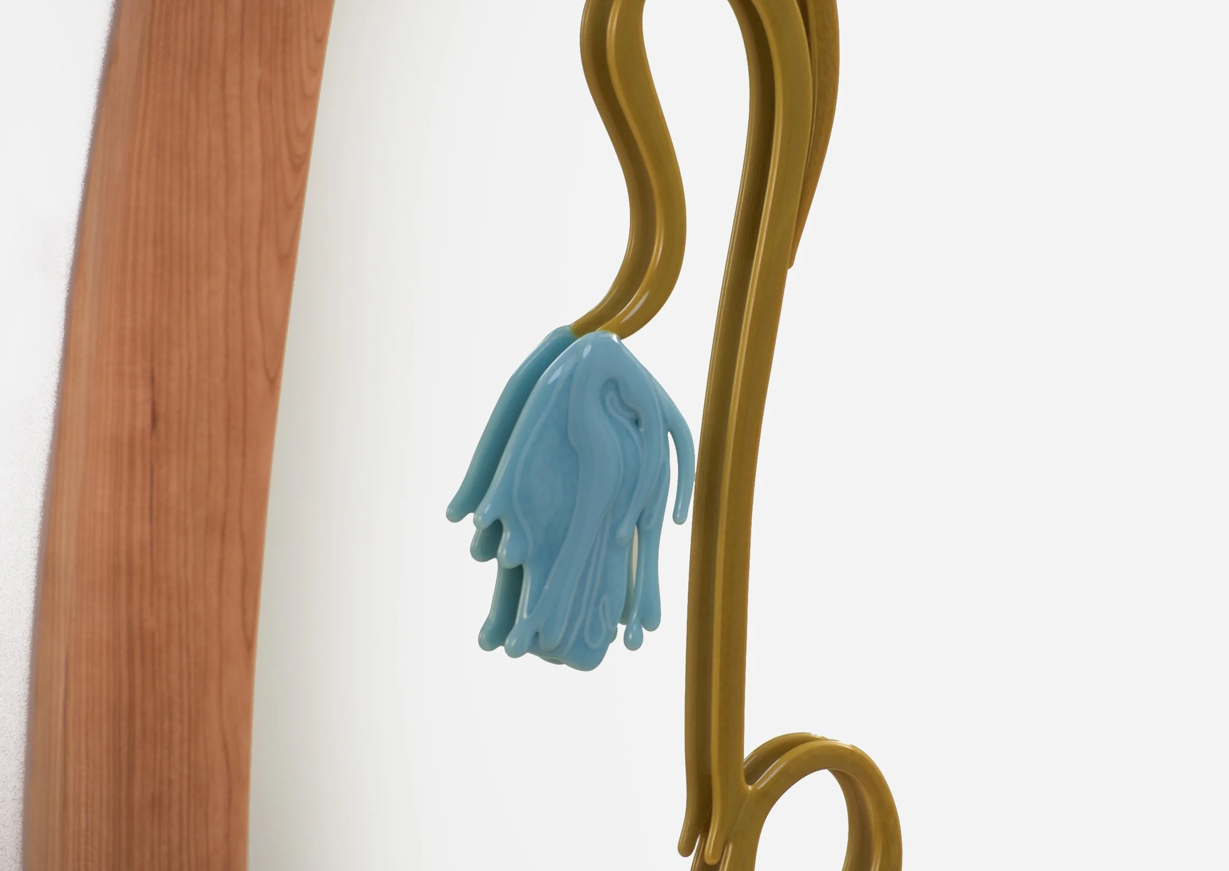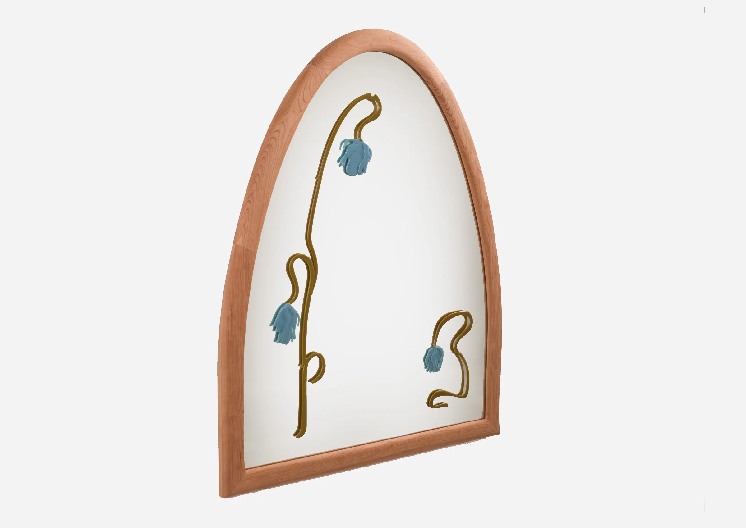 A hand carved cherry archway frames three cut fused glass flowers. Layered petals are stacked and fused in the kiln, each stem is cut and fused to fit together like a puzzle on top of the frame.